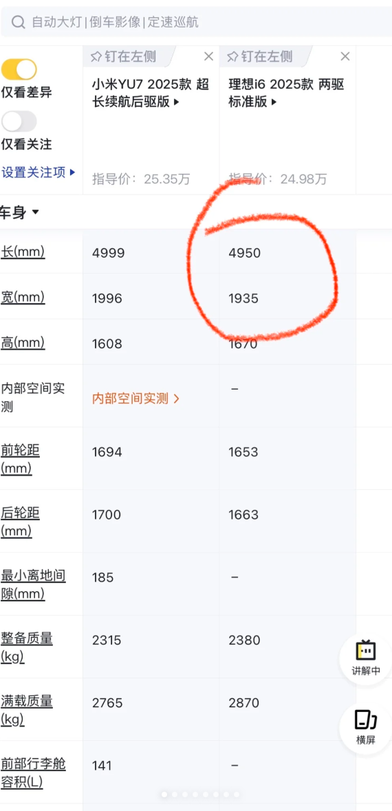 先看核心的“价格与配置倒挂”现象。理想i6不仅指导价更低,在关键配置上还更“舍得给”。智能驾驶层面,理想i6标配城市+高速路段导航辅助驾驶、循迹倒车、记忆泊车,甚至连高精度地图选装包都是标配;而小米YU7的这些智驾功能全需“额外掏钱选装”,单是匝道自动驶出(入)、高速路段导航辅助驾驶的选装成本,就可能让两车实际价差进一步拉大。有网友算过一笔账:“小米要选装到理想i6的智驾水平,至少得多花2万,这么算下来理想反而便宜了近2.5万”。