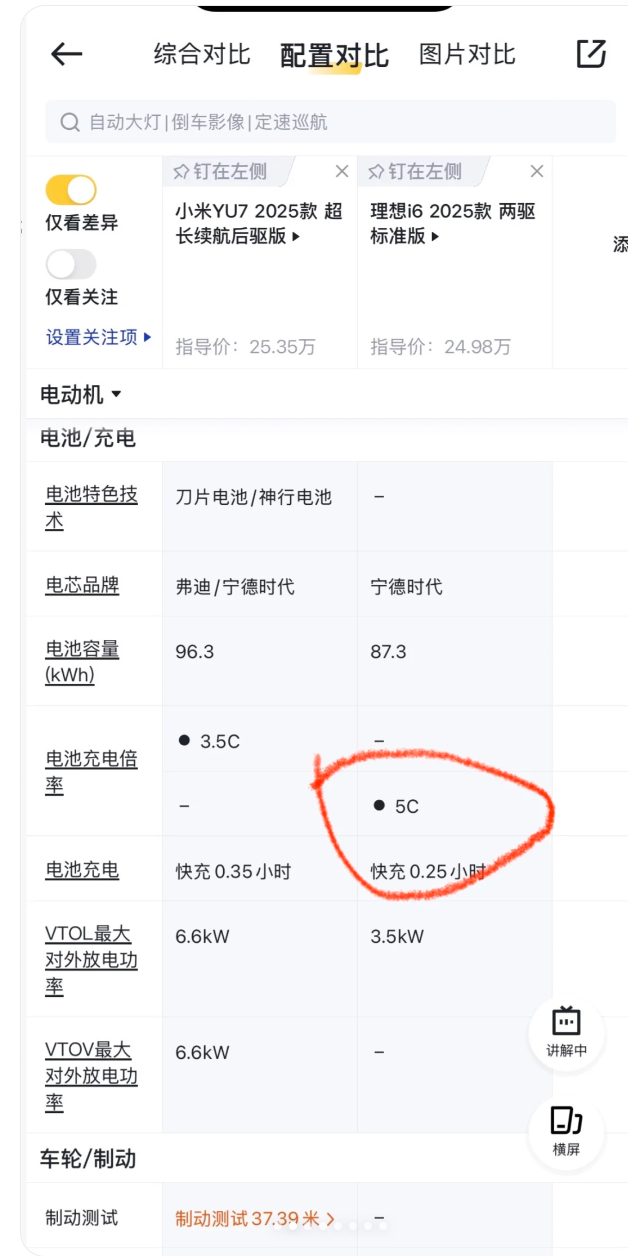 补能效率是另一大差距。理想i6用的是宁德时代5C麒麟电池,容量87.3kWh,快充仅需0.25小时(约15分钟)就能补能;小米YU7虽电池容量更大(96.3kWh,弗迪/宁德时代刀片电池/神行电池),但充电倍率仅3.5C,快充需要0.35小时(约21分钟)。对经常跑长途的用户来说,“6分钟的补能差”可能意味着少等一轮排队,实用性更高。不过也有网友指出:“小米电池容量多了9度,理论续航会更长,适合充电不方便、看重长续航的家庭用户”。