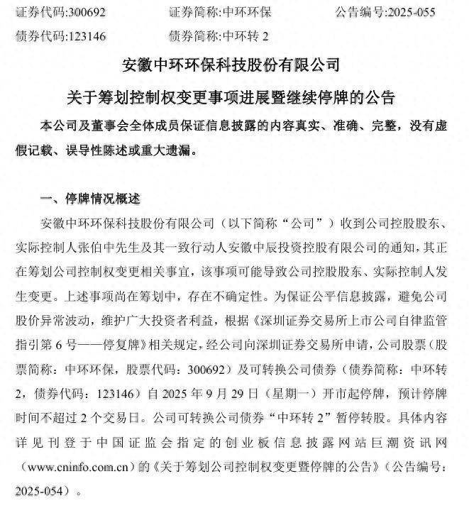 10月8日,中环环保(300692)发布公告,控股股东、实际控制人张伯中及其一致行动人正在筹划公司控制权变更相关事宜,该事项可能导致公司控股股东和实际控制人发生变更。为避免股价异常波动,维护投资者利益,公司自2025年9月29日起停牌,预计停牌时间不超过2个交易日。