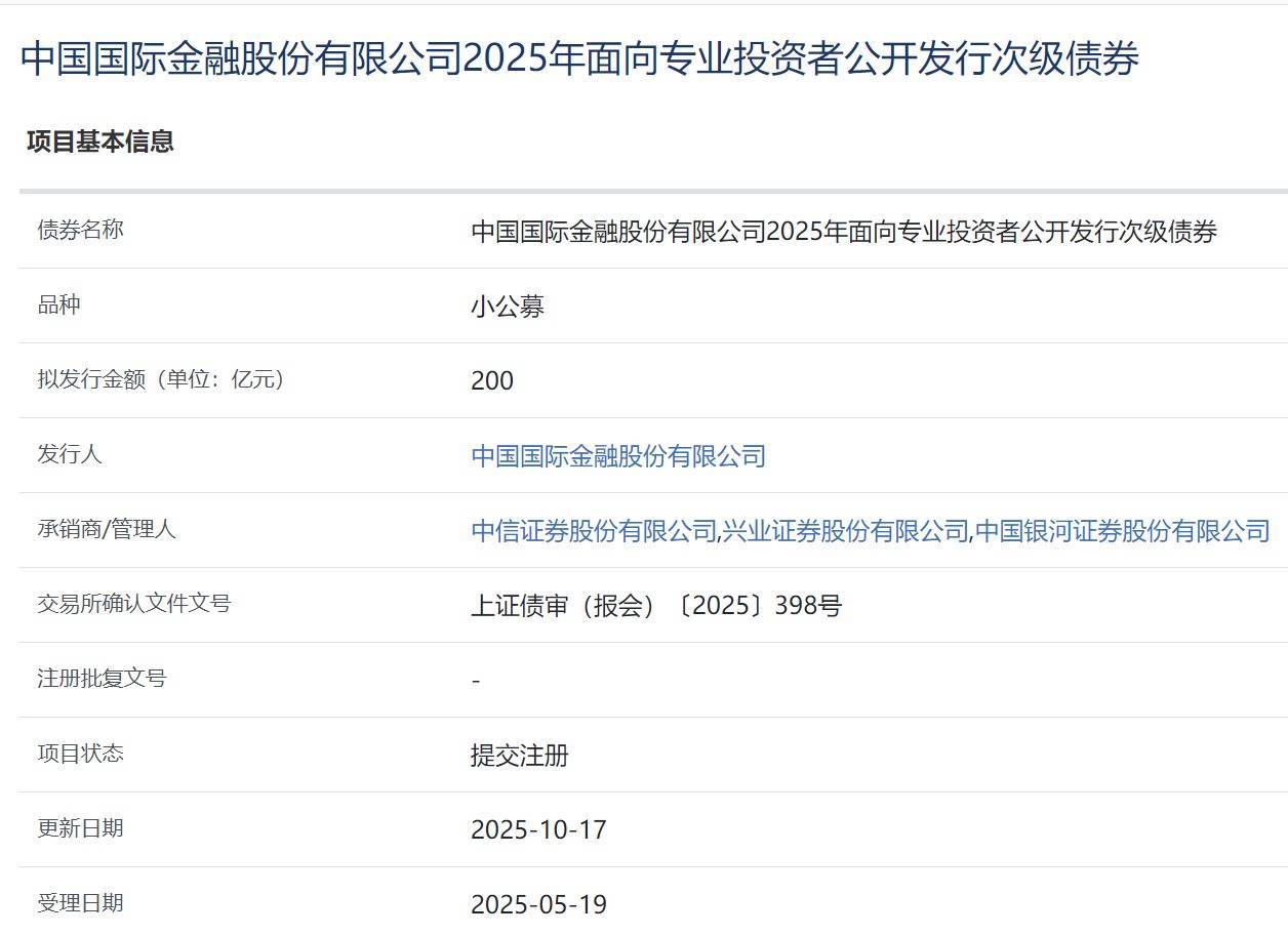【大河财立方消息】10月18日消息,中国国际金融股份有限公司2025年面向专业投资者公开发行次级债券项目提交注册。本期债券拟发行规模200亿元,承销商/管理人为中信证券、兴业证券、中国银河证券。