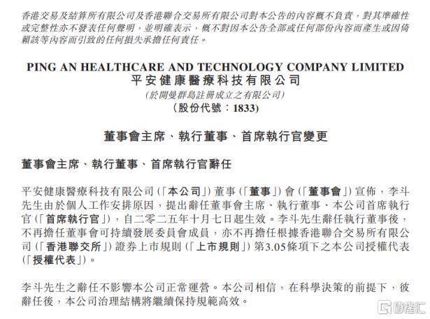 十月伊始,平安好医生(01833.HK)发布公告,李斗先生因个人工作安排辞任公司董事会主席、执行董事、首席执行官,现任平安集团联席首席执行官、平安好医生非执行董事郭晓涛将兼任该公司董事会主席一职,委任何明科为公司首席执行官、执行董事,自公告之日起生效。